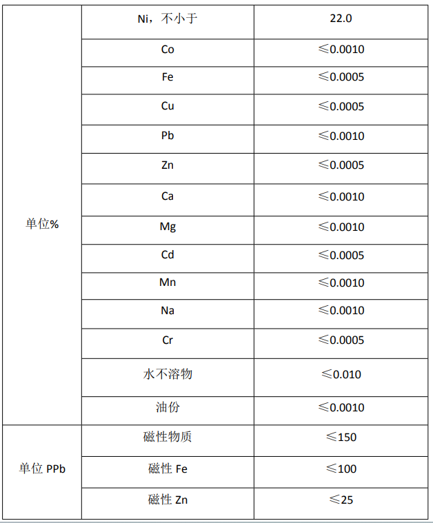 用途:主要用于三元電池正極材料、鎳隔電池、電鍍工業(yè)、印染工業(yè)絡(luò)合劑、還原染料的煤染劑、催化劑,以及無機(jī)工業(yè)用作生產(chǎn)其他鎳鹽如硫酸鎳銨、氧化鎳、碳酸鎳等的主要原料。